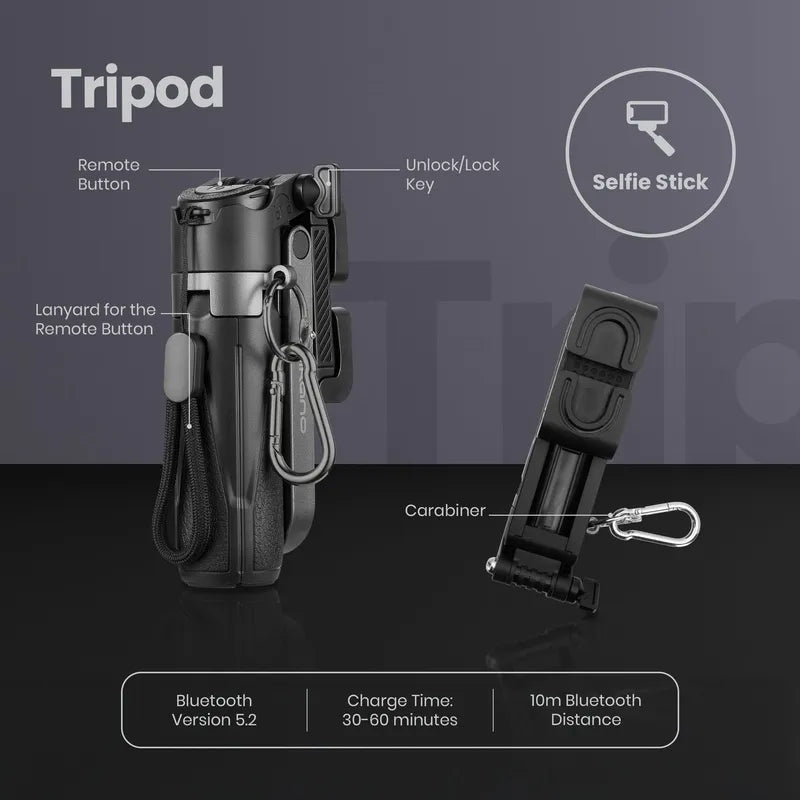 Product size:57*48*116mm Color: Black Material: ABS+Aluminum alloy Shrink length:11.7cm-43cm Remote Control Battery:401020 polymer Charging condition:5V 1A Charging interface: Type-C Battery capacity:55mAh Charging current:≈50mA Full charging time:≈30-60 minutes Bluetooth version: Bluetooth 5.2